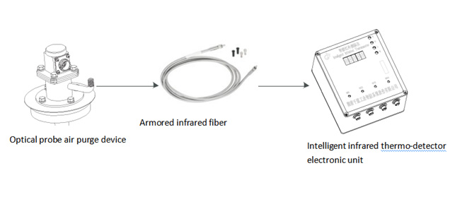 Intelligent infrared thermodetector is a non-contact surface temperature thermodetector, which is highly sensitive, accurate and stable. It consists of four parts: precision fixed focus optical system, high temperature resistant stainless steel armored infrared transmission fiber, and intelligent processing circuit unit air purge device (DSP core)