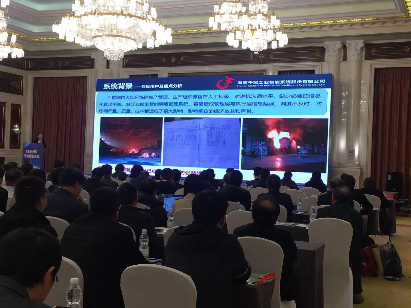 本次高峰論壇設有五大主題會議:“中國鋼鐵工業智能制造高峰論壇”,“鋼鐵企業云計算、大數據、人工智能和工控網絡安全研討會”,“鋼鐵設備備件互聯網+采購大會”,“鋼鐵企業設備在線監測與智能傳感技術研討會”和“鋼鐵行業智能制造采購需求與技術對接會”。會上各參展單位和公司各抒己見,就“鋼鐵工業智能制造現狀和解決方案”展開深入交流討論。千盟物聯總經理錢艷萍女士分別從“系統背景及目標”,“功能案例及介紹”和“成果展示”三個方面全面介紹了煉鋼智能系統。