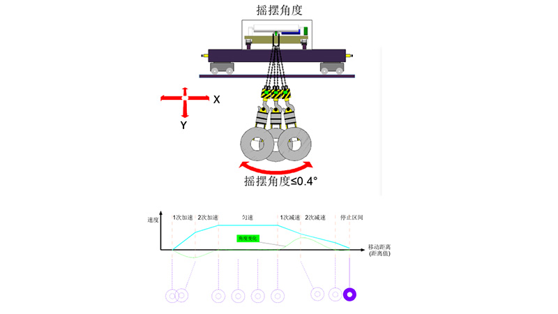 天車在變速運動中主鉤速度變化會滯后于大車和小車的速度變化,不可避免的會發生主鉤晃動的情況,這給天車的安全運行帶來了風險,為了消除這種速度變化不同步帶來的角度搖擺,讓天車在最短的時間內平穩的達到目標位置,天車系統的設計中需加入防搖擺控制技術。
